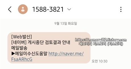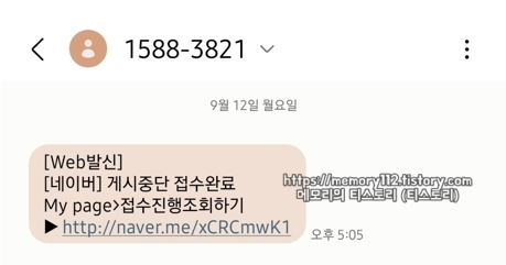 게시 중단 요청 접수를 완료하면 이렇게 접수 완료 안내 문자를 받게 됩니다.