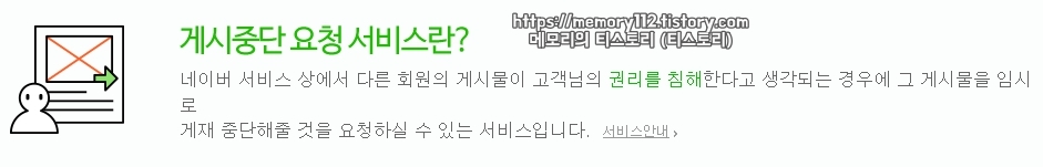 네이버에는 다른 사람들의 인터넷상 권리를 보호해 줄 수 있는 "게시중단 요청 서비스"라는 것 있습니다. 티스토리, 워드프레스 블로그 등에 올라가 있는 다른 사람들이 정성 들여 적은 포스팅을 작성자의 허락도 없이 가져가 본인의 네이버 블로그 같은 곳에 올렸다면 우리는 이 서비스를 통해 게시물 게시 중단 요청을 할 수 있습니다.
