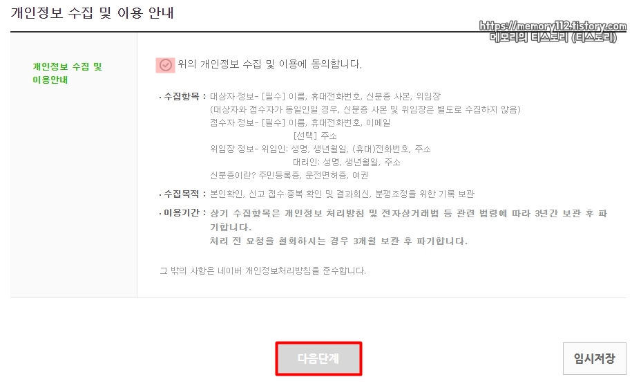 개인정보 수집 및 이용안내 동의를 한 후, 아래에 보이는 다음단계를 눌러줍니다.