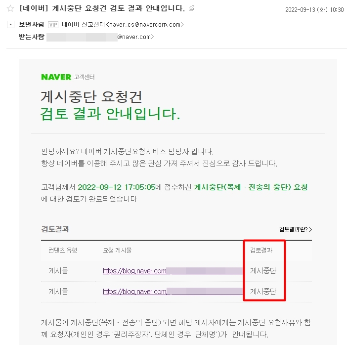 저 같은 경우에는 네이버 블로그에 작성된 게시물 2개를 게시 중단 요청했었는데요. 적격성 검토 결과 두 게시물 모두 "게시중단" 되었네요.
