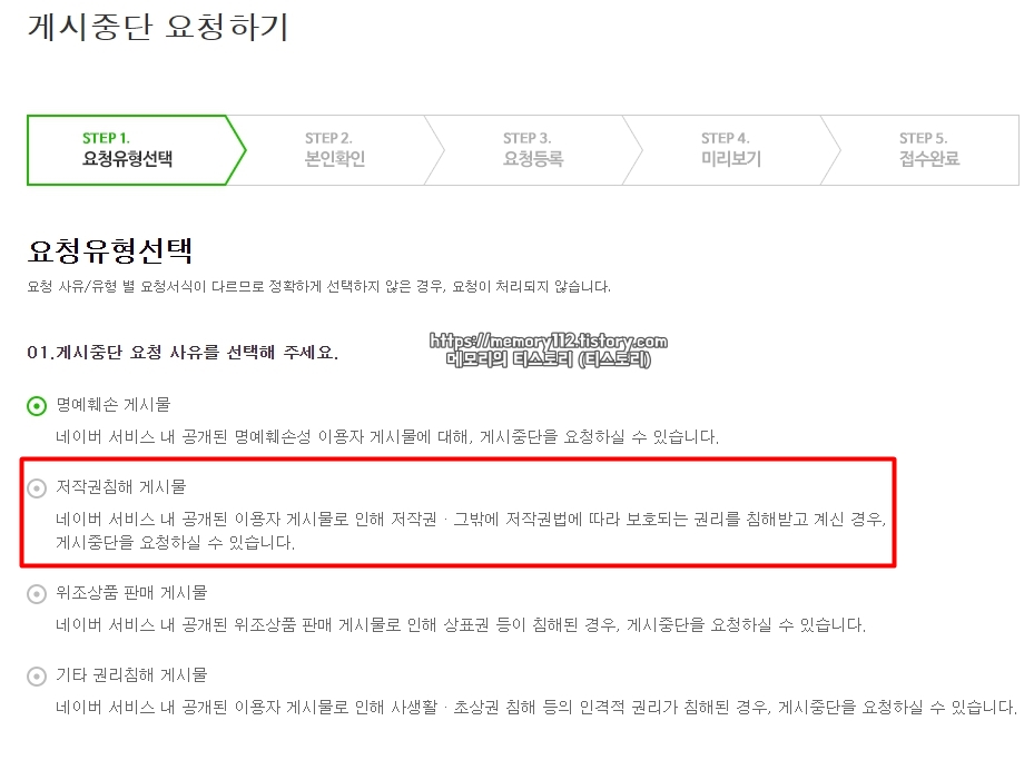 게시중단 요청 사유를 "저작권침해 게시물"로 선택해줍니다.