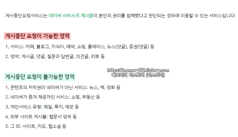 게시중단 요청이 불가능한 영역은 콘텐츠의 저작권이 네이버가 아닌 서비스(뉴스, 책, 영화 등), 네이버가 중개 제공자인 서비스(쇼핑, 부동산 등), 개인 서비스(메일, 쪽지, 메모 등), 외부 사이트 게시물(네이버 검색 웹문서 영역), 그 외(사이트, 지도, 웹소설 등)입니다.