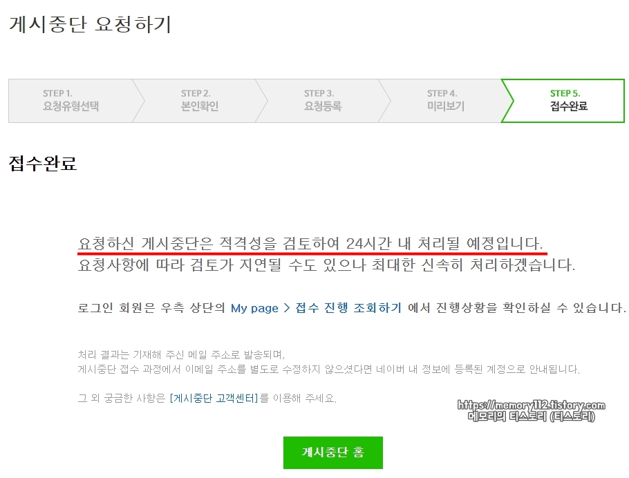 그러면 이렇게 게시 중단 요청이 완료됩니다. 게시 중단 처리는 소명 내용을 토대로 적격성을 검토하여 24시간 내로 처리될 것입니다.