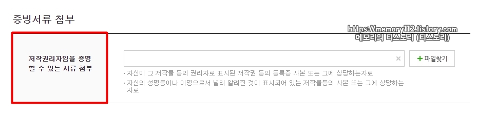 저작권리자임을 증명할 서류를 첨부해줍니다. 저 같은 경우에는 블로그 주소가 보이는 블로그 관리 메뉴를 캡처해 이미지를 첨부했습니다.