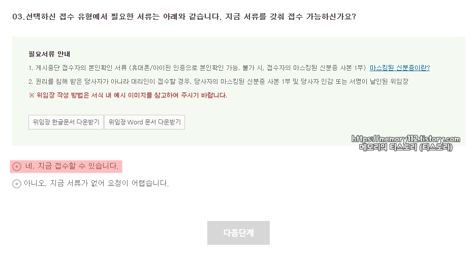 모든 정보를 빠짐없이 입력하고 서약 및 동의까지 해주었다면, 아래에 보이는 다음단계 버튼을 눌러줍니다.