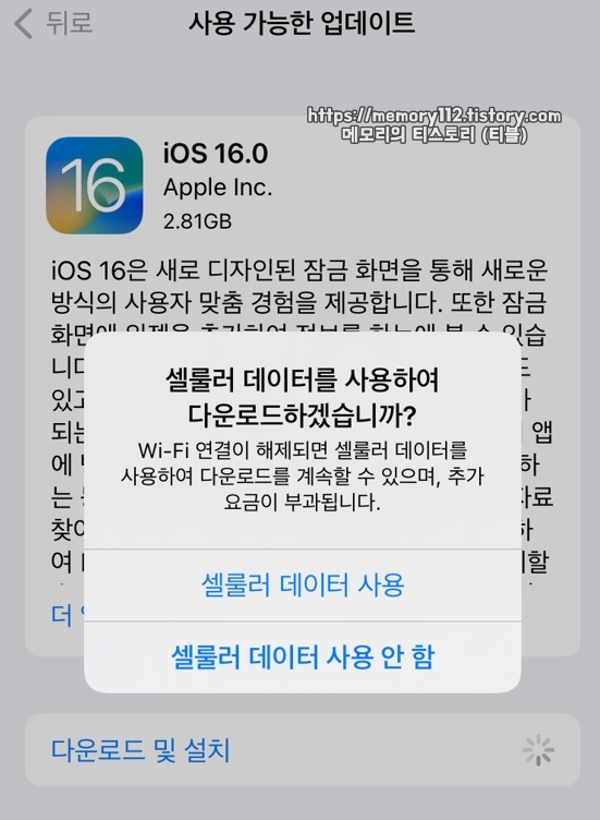 아래에 보이는 다운로드 및 설치를 누른 후, 소프트웨어 다운로드 시 셀룰러 데이터를 사용할 것인지 와이파이를 사용할 것인지 선택해줍니다.