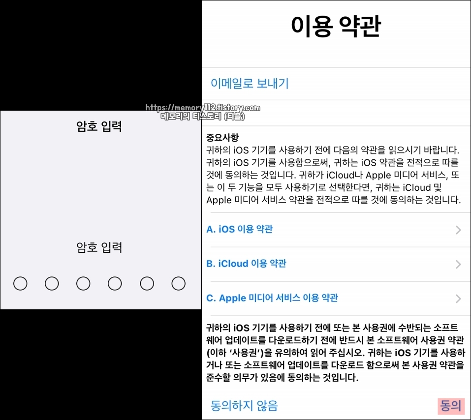 아이폰에서 사용하는 암호를 입력한 후, 이용 약관 동의를 해줍니다.
