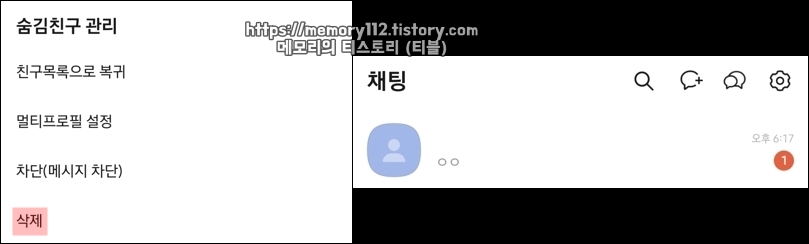 참고로 차단한 친구는 친구 삭제가 불가능합니다. 숨김 처리한 친구만 삭제할 수 있어요.