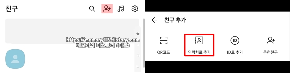 카카오톡 실행 후, 상단에 보이는 친구 추가 버튼을 눌러줍니다. 그리고 이어서 '연락처로 추가'를 눌러줍니다.