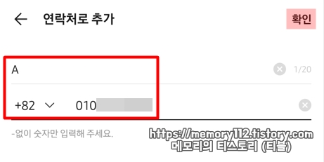 그러면 이렇게 친구 추가 창이 뜨는데요. 여기서 추가할 친구의 '프로필 이름'을 입력하고, 아래에는 휴대폰 번호를 입력해줍니다. 모두 입력했다면, 우측 상단에 보이는 확인 버튼을 눌러줍니다.