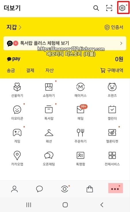 이어서 더보기 탭으로 이동한 후, 우측 상단에 보이는 '설정(톱니바퀴 모양)'을 눌러줍니다.
