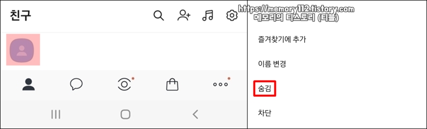 이제부터 친구 삭제 방법을 한 번 알아볼까요? 일단 먼저 삭제할 친구 프로필을 꾹 눌러줍니다. 그리고 이어서 '숨김'을 눌러줍니다.