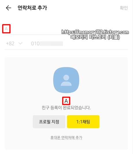 휴대폰 번호를 정확히 입력해줬다면, 이렇게 친구 등록이 완료될 것입니다. 해당 친구의 프로필 이름은 내가 입력했던 이름 그대로 추가됩니다.