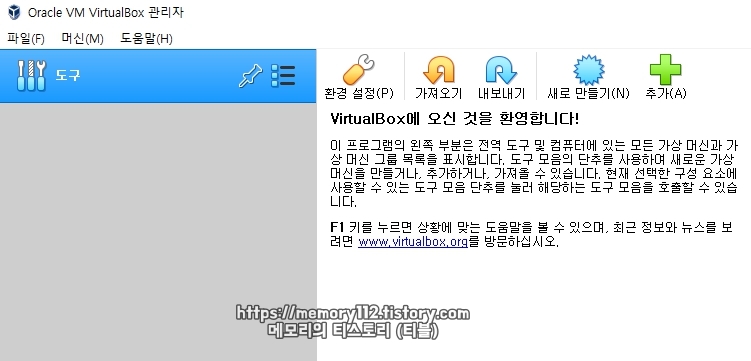 오라클의 버추얼박스 실행이 완료된 모습입니다. 이제부터 내가 원하는 운영체제를 선택해 가상 OS로 만들어 사용할 수 있습니다.
