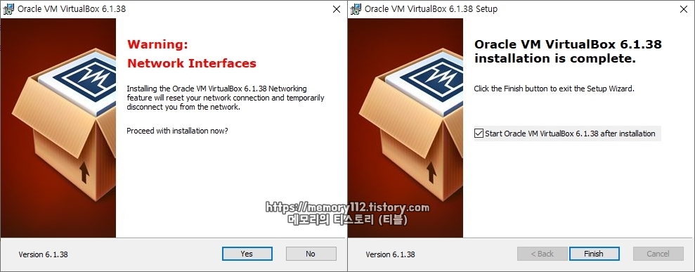 네트워크 설정을 재설정한다는 문구가 뜨면 'Yes'를 눌러줍니다. 그러고 조금만 기다려주면 이렇게 버추얼박스 설치가 완료되죠.