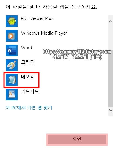 그리고 여기서 '메모장'을 선택한 후, 아래에 보이는 확인 버튼을 눌러줍니다.
