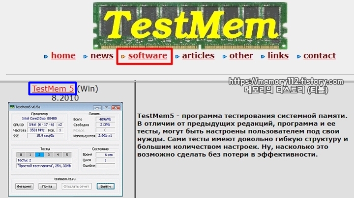 홈페이지 접속 후, 상단에 보이는 'software(소프트웨어)'를 눌러줍니다. 이어서 목록에 보이는 'TestMem 5'를 눌러줍니다.