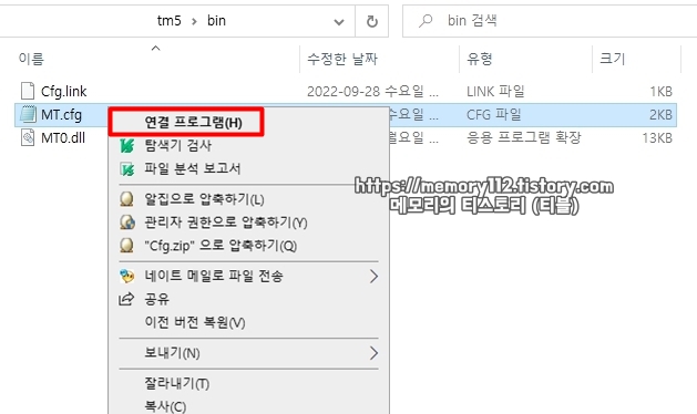 'MT.cfg'를 메모장으로 여는 방법은 해당 우클릭을 한 후, '연결 프로그램(H)'를 눌러줍니다.
