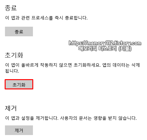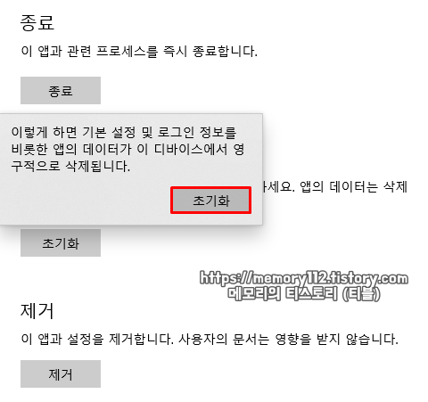 그러면 이렇게 "이렇게 하면 기본 설정 및 로그인 정보를 비롯한 앱의 데이터가 이 디바이스에서 영구적으로 삭제됩니다."라는 안내 메시지가 뜰 텐데요. 여기서 '초기화'를 눌러줍니다.