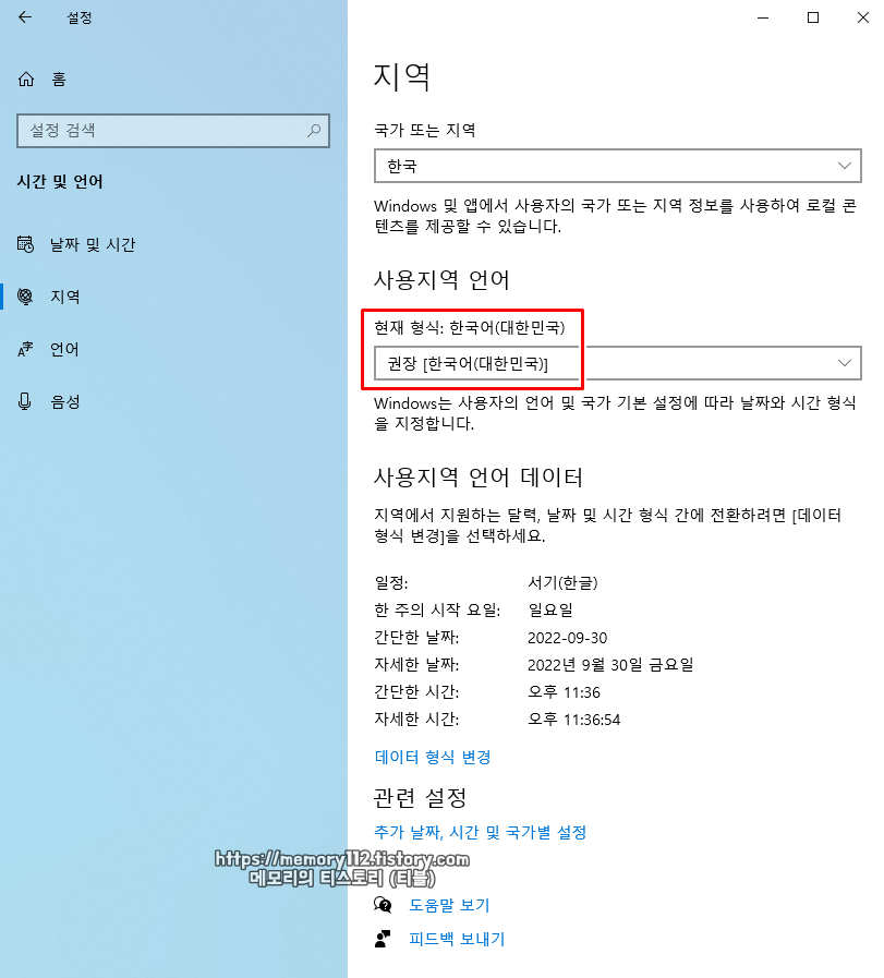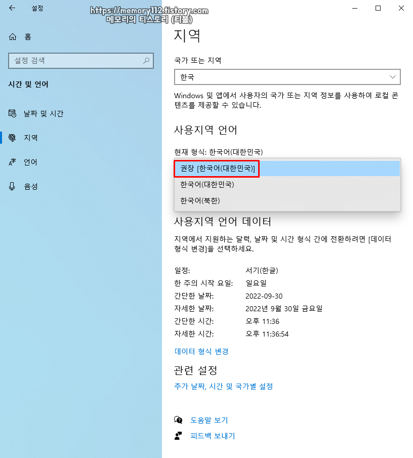 지역 탭으로 이동한 후, 사용 지역 언어를 '권장 [한국어(대한민국)]'으로 설정을 바꿔줍니다.