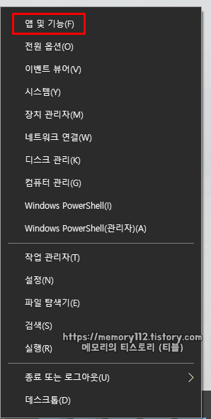 먼저 시작 메뉴에 마우스를 대고 우클릭한 후, 상단에 보이는 '앱 및 기능'을 눌러줍니다.