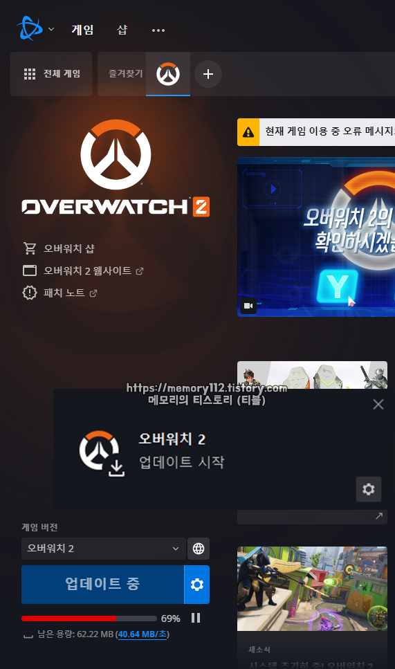 오버워치 2 게임 오픈 이후, 배틀넷 게임 런처를 실행하니 이렇게 자동으로 '오버워치 2' 업데이트가 시작됐다. 필자는 어제 오버워치 2 사전 설치를 완료했기 때문에 오버워치2 업데이트는 그렇게 오래 걸리지 않았다.