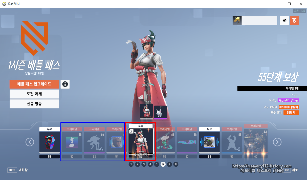 오버워치 2에서 핫한 신규 영웅 키리코는 1 시즌 배틀 패스 55단계를 클리어해야 얻을 수 있다.