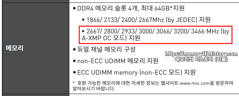메인보드 램 오버 XMP 기능 지원 여부는 메인보드 매뉴얼 정보를 통해 확인할 수 있습니다. 위 사진을 보면 XMP 램 클럭 최대 3466 MHz까지 설정된 XMP를 사용할 수 있다고 되어있네요. 지원 클럭 이상의 값을 사용하는 XMP 램이라면 다른 메인보드를 찾아보는 것이 좋습니다.