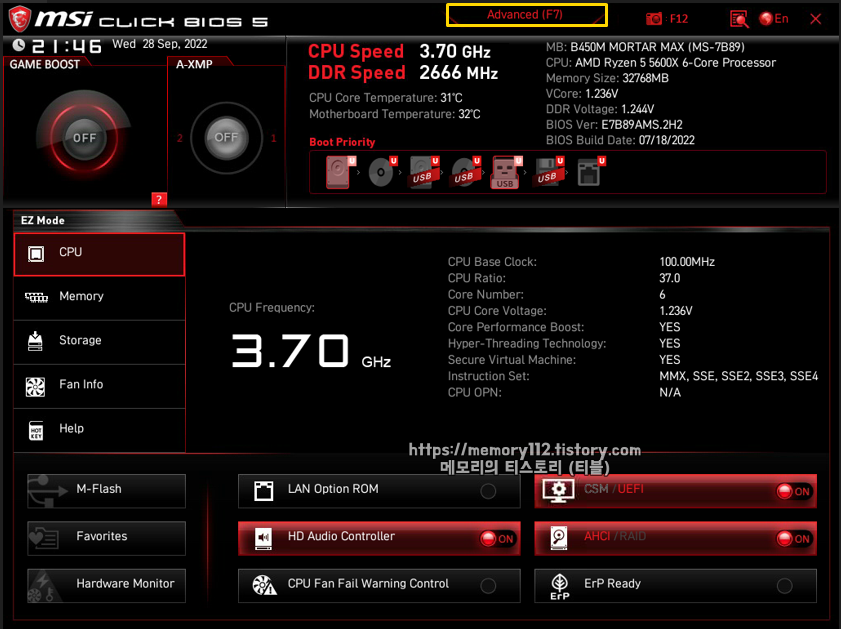 이제부터 라이젠 XMP 기능 활성화 방법을 알아보도록 하겠습니다. 컴퓨터를 부팅 시 키보드의 DEL 키를 눌러 위와 같이 CMOS 화면으로 진입해줍니다. CMOS 화면 진입 후, 원활한 설정을 위해 F7 키를 눌러 CMOS 화면을 어드벤스드(Advanced) 모드로 변경해줍니다.