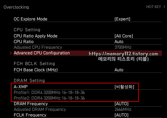A-XMP 메뉴에서 엔터키를 누르면 XMP 기능을 비활성화 하거나 프로파일 1 또는 2를 사용할 수 있도록 설정할 수 있습니다.