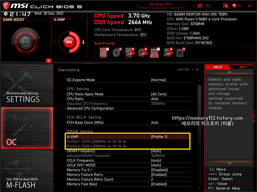 메인보드에서도 XPM 기능을 지원하고, 또 XMP 프로파일 설정 정보를 가지고 있는 튜닝램이 있다면 메인보드 CMOS 화면에서 XMP 기능을 활성화해 더욱 손쉬운 램 오버클럭을 할 수 있습니다.