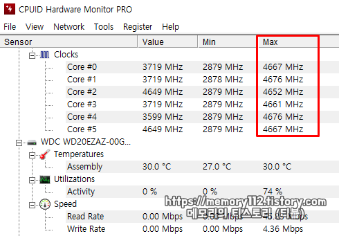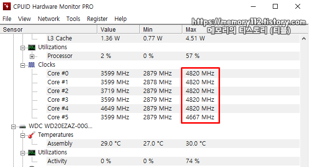 참고로 CPU 클럭(동작 속도) 맥스 치는 CPU 온도, CPU 수율, 컴퓨터 본체 쿨링 능력에 따라 조금씩 다르게 나옵니다.
