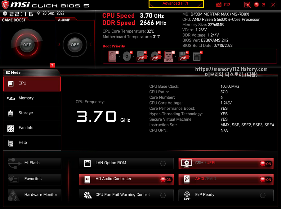 그럼 이제 PBO 설정 방법을 한 번 알아볼까요? 일단 먼저 바이오스 화면으로 진입해줍니다. 그리고 F7 키를 눌러 Advanced(고급 모드)로 변경해줍니다.