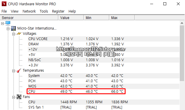 참고로 저는 5600x PBO를 켰을 때 CPU 온도가 최저 46도, 최고 66도였습니다. 이것은 일반적인 웹서핑 및 가벼운 작업을 했을 때 기준 온도이며, 오버워치 같은 고사양 게임을 켜서 하면 CPU 온도가 70 중반까지는 올라가더라고요.