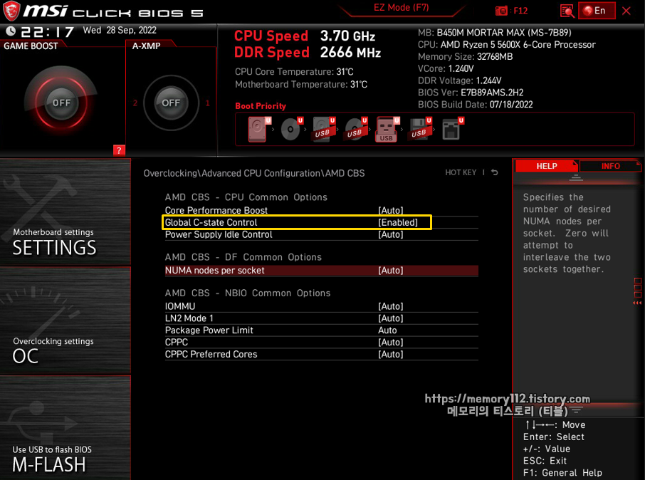 AMD CBS 메뉴에서 "Global C-State Control"을 Enabled로 변경해줍니다.