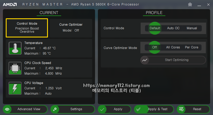 PBO 설정 저장 및 재부팅을 완료했다면, 이제 라이젠 PBO 기능이 제대로 활성화되었는지 확인할 차례입니다. PBO 기능 활성화 여부는 AMD의 '라이젠 마스터'라는 프로그램을 통해 확인할 수 있습니다. 라이젠 마스터를 실행했을 때 Control Mode(컨트롤 모드)가 위 사진처럼 Precision Boost Overdrive라면 PBO가 제대로 켜진 것입니다.