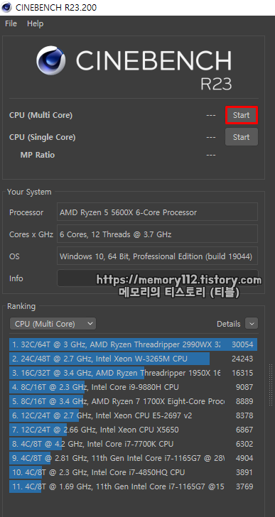 시네벤치R23 다운로드 및 사용법 (CPU 성능 확인)
