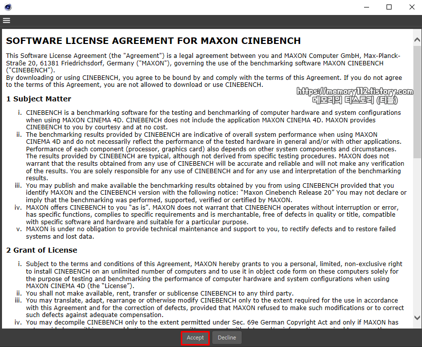 프로그램을 실행한 후, 프로그램 이용 약관 "Accept(수락)"을 눌러줍니다.