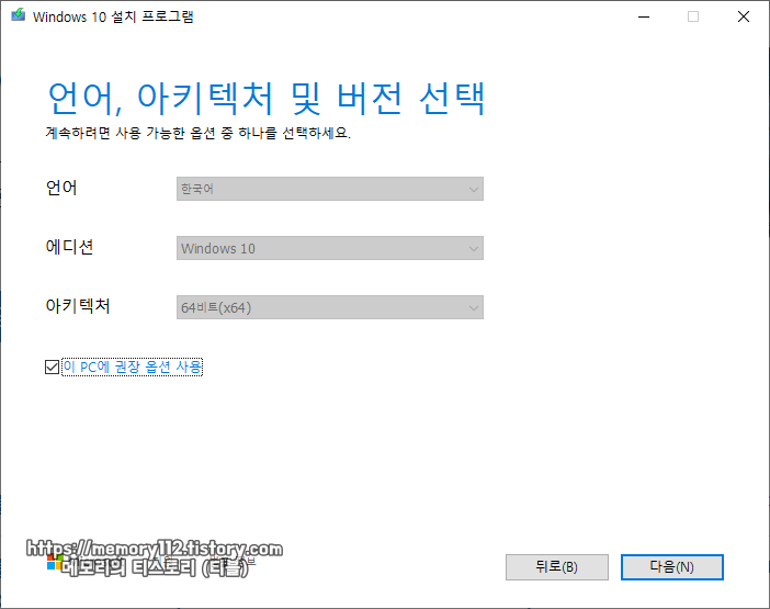 언어(한국어), 에디션(윈도우 10), 아키텍처(64비트)를 선택한 후, 다음을 눌러줍니다.