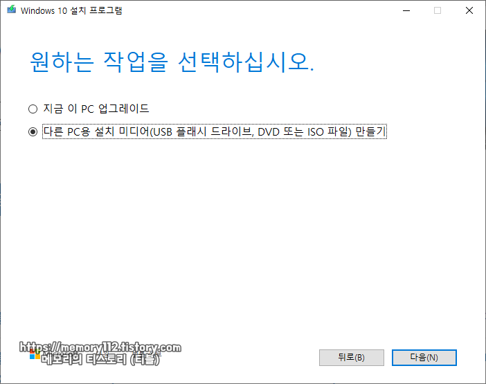 다운로드한 파일을 실행한 후, "다른 PC용 설치 미디어(USB 플래시 드라이브, DVD 또는 ISO 파일) 만들기"를 선택해줍니다.