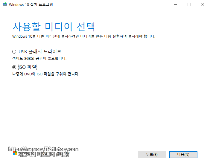 참고로 "USB 플래시 드라이브"를 선택하면 윈도우10 ISO 파일을 바로 USB로 마운트 시킬 수 있습니다. (8기가 이상의 USB 필요)
