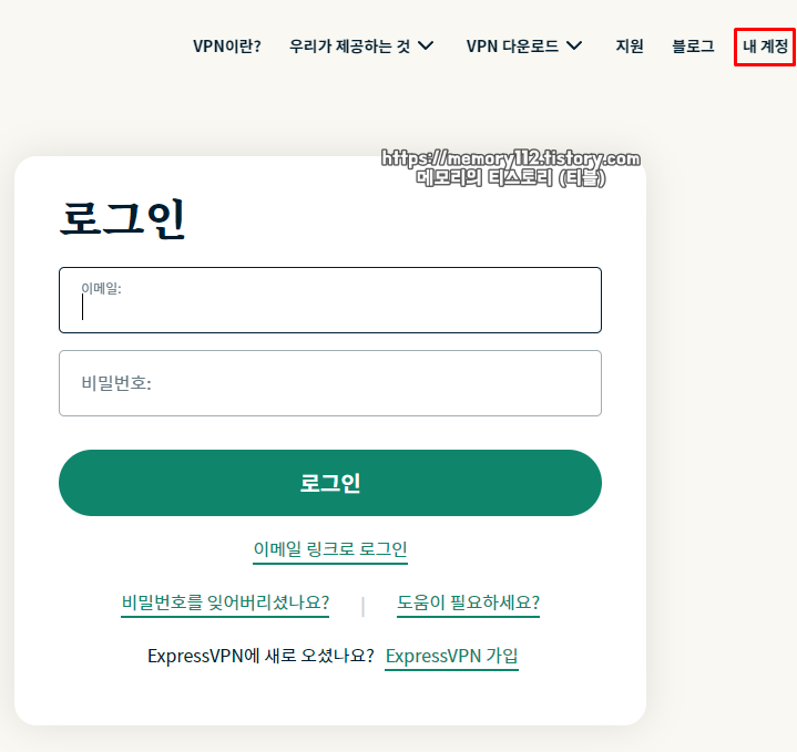 홈페이지 접속 후, 우측 상단에 보이는 "내 계정"을 눌러 로그인을 해줍니다.