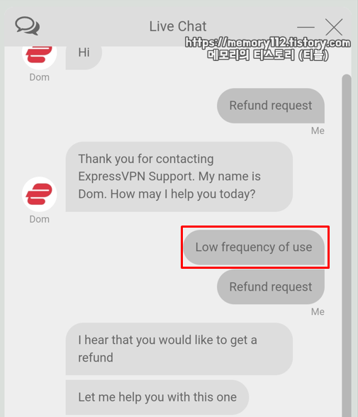 아무튼 이렇게 익스프레스 VPN 상담원과 연결이 되면 실시간으로 채팅을 주고받을 수 있게 되는데요. 익스프레스 VPN은 국내가 아닌 해외에서 운영되고 있는 것이기 때문에 상담원은 영어를 사용합니다. 그렇기 때문에 상담 내용은 영어로 하는 것이 좋습니다. 그렇다고 해서 한글로 상담이 안 되는 것은 아닙니다. 다른 사람이 올린 환불 요청 후기를 보니 한글로 상담 내용을 입력해도 상담원과 문제없이 소통이 되더라고요? (따로 번역기를 돌리는 듯함.)