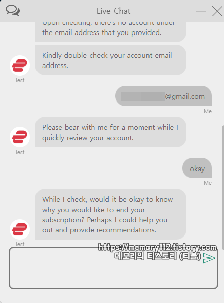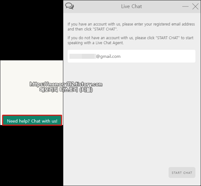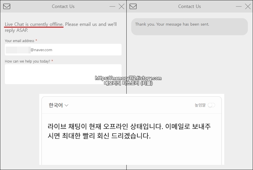 상담 시작 버튼을 눌렀는데 위와 같이 이렇게 "Live Chat is currently offine."이라고 표시된다면 현재 실시간 상담이 가능한 상담원이 없다는 뜻입니다. 이것은 일반적인 이메일 상담에 불과하기 때문에 환불 요청을 원한다면, 조금 있다가 나중에 채팅 상담을 해보시길 바랍니다.
