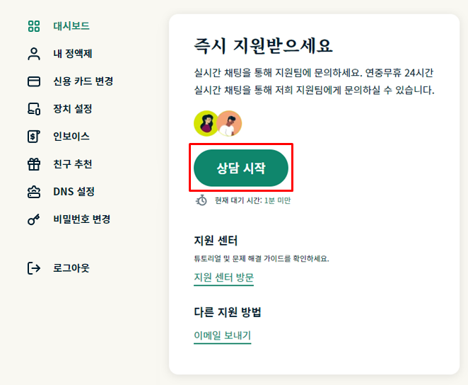 로그인을 완료하게 되면, 이렇게 대시보드 메뉴로 이동되는데요. 여기서 우측에 보이는 "상담 시작"을 눌러줍니다.
