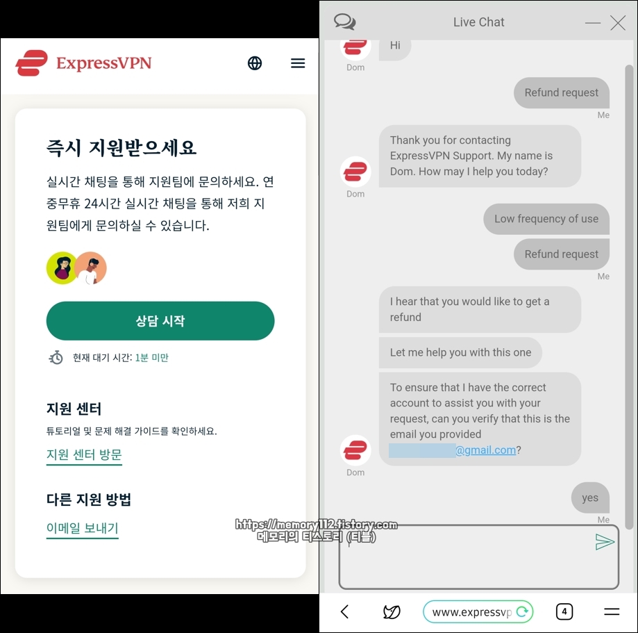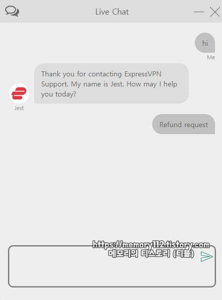 익스프레스 VPN 이용료 환불 신청은 ExpressVPN 지원팀에게 직접 연락하는 것으로 가능합니다. (1대1 실시간 라이브 채팅) 환불 요청 방법도 그렇게 까다롭지 않고요.
