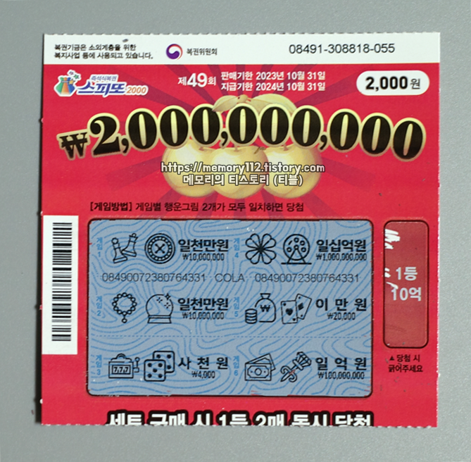 스피또2000 49회차 복권 디자인입니다. 이번에는 황금 동전과 황금 체리 그림으로 구성돼서 나왔네요. 게임 방법은 행운 그림 2개가 일치하면 해당 금액 당첨입니다.