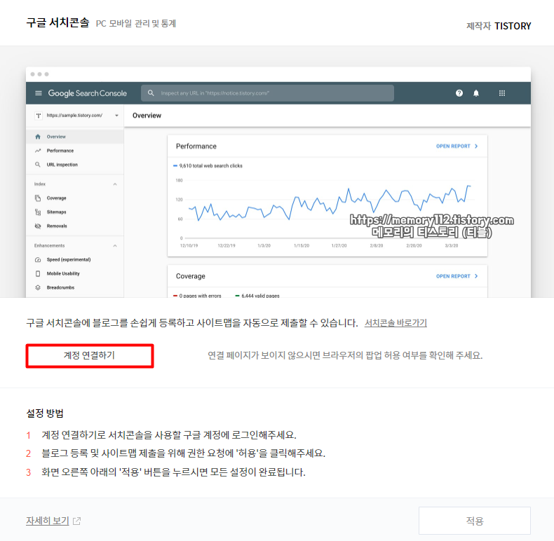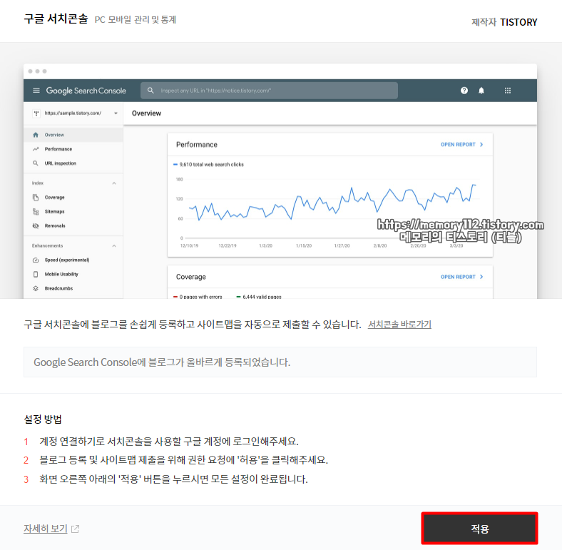 연결을 완료했다면 이제 아래에 보이는 적용 버튼을 눌러주면 구글 서치 콘솔 연결 및 등록 끝입니다.