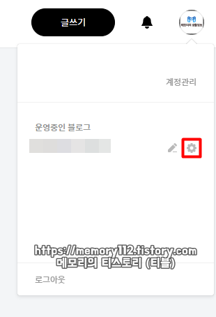 구글 서치 콘솔 등록 방법으로는 여러 가지가 있지만 티스토리 블로그 같은 경우는 해당 사이트에서 기본적으로 지원하는 플러그인을 통해 쉽게 연결하고 등록할 수 있습니다. 일단 먼저 티스토리 블로그 관리 창으로 들어와줍니다. 그리고 이어서 우측 상단에 보이는 프로필을 누른 후, 블로그 설정(톱니바퀴 모양)을 눌러줍니다.