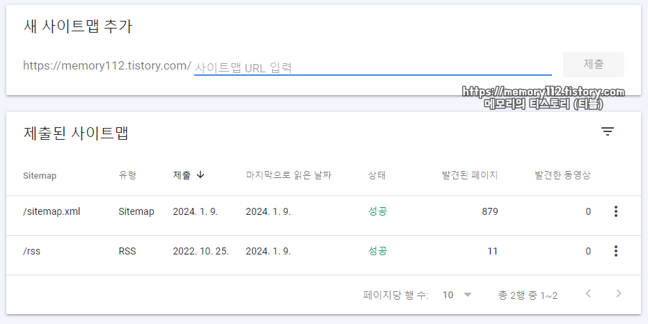사이트맵(Sitemaps)을 눌러서 보면 여기에 평소에는 못 보던 "/sitemap.xml"이라는 것이 추가된 것을 알 수 있습니다. 이 상태가 되면 구글 검색 로봇이 내 블로그 컨텐츠를 긁어갈 수 있는데요. 그것이 검색 결과 노출까지 이어지는 색인까지 갈 수 있을지는 알 수 없습니다. (컨텐츠 질과 양에 자신있는 블로그라면 크롤링부터 색인까지 크게 문제없을 것임.)